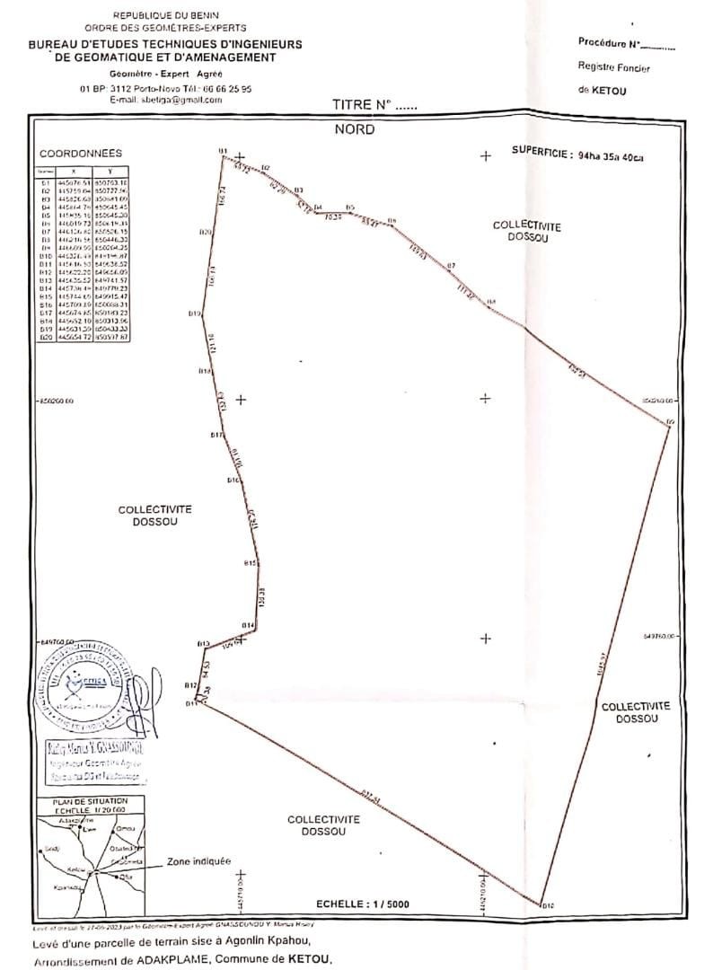 Un domaine agricole morcelé en plusieurs hectares, situé à ketou plus AGONLI-KPAHOU à 12 kilomètres du goudron. Une zone très accessible. Ce domaine est proche du domaine de l'ex président du Nigeria, et de certain cadre Béninois. Mise en vente à 788.200fcfa avec les formalités administratives pas hectare, et a 450.000fcfa sans les formalités.