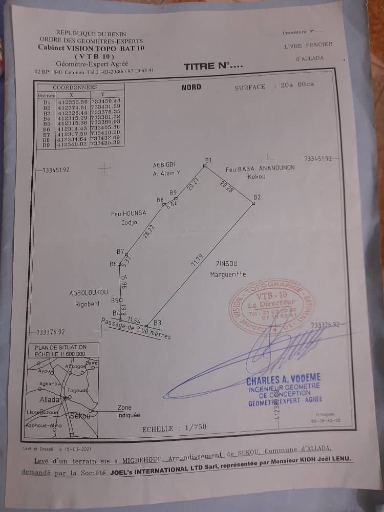 - Nature du Titre de propriété : Levé Topographie