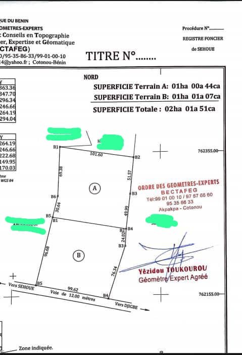 A vendre Un domaine de *2 hectares* avec de palmiers sélectionné à 6 ans d'âge à Sèhouè commune de TOFFO. Le prix sera déterminer avec le propriétaire au moment opportun. Papier : ADC Propriétaire vivant *Prix des deux hectares : 8,500,000F* Acquéreur 5%