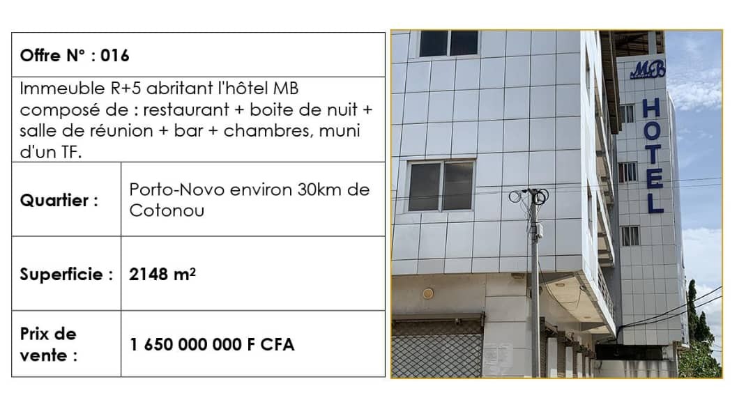 𝐈𝐌𝐌𝐄𝐔𝐁𝐋𝐄 𝐑+𝟓 𝐀 𝐕𝐄𝐍𝐃𝐑𝐄 𝐏𝐎𝐑𝐓𝐎- 𝐍𝐎𝐕𝐎 Nous mettons en vente un immeuble R+5 munis d'un TF abritant l'hôtel MB composé de: restaurant+ boîte de nuit+ salle de réunion+ bar+ chambres Superficie: 2148 m2 Prix: 1.650.000.000F CFA 𝗖𝗼𝗻𝘁𝗮𝗰𝘁: (+𝟮𝟮𝟵) 𝟵𝟔 𝟕𝟑 𝟖𝟑 𝟐𝟗 𝗔𝗽𝗽𝗲𝗹 & 𝘄𝗵𝗮𝘁𝘀𝗮𝗽𝗽𝘀 https://wa.me//22996738329 Veuillez visiter et aimer notre page via ce lien pour avoir toutes l'actualité immobilière du Bénin Page Facebook : https://www.facebook.com/229immobiliers/ Site web: https://www.benin-immobilier.com ------------- POUR LA VENTE RAPIDE ET LA GESTION DE VOS BIENS IMMOBILIERS AU BÉNIN CONCTACTEZ-NOUS