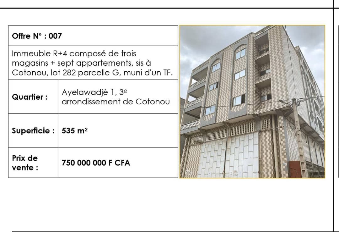 𝐈𝐌𝐌𝐄𝐔𝐁𝐋𝐄 𝐑+𝟒 𝐀 𝐕𝐄𝐍𝐃𝐑𝐄 𝐀 𝐀𝐘𝐄𝐋𝐀𝐖𝐀𝐃𝐉𝐄 𝟏 Nous mettons en vente un immeuble R+4 composé de 3 magasins+ 7 appartements sur une parcelle munis d'un TF à ayélawadjè 1. Superficie: 535 m2 Prix: 750.000.000F CFA 𝗖𝗼𝗻𝘁𝗮𝗰𝘁: (+𝟮𝟮𝟵) 𝟵𝟔 𝟕𝟑 𝟖𝟑 𝟐𝟗 𝗔𝗽𝗽𝗲𝗹 & 𝘄𝗵𝗮𝘁𝘀𝗮𝗽𝗽𝘀 https://wa.me//22996738329 Veuillez visiter et aimer notre page via ce lien pour avoir toutes l'actualité immobilière du Bénin Page Facebook : https://www.facebook.com/229immobiliers/ Site web: https://www.benin-immobilier.com ------------- POUR LA VENTE RAPIDE ET LA GESTION DE VOS BIENS IMMOBILIERS AU BÉNIN CONCTACTEZ-NOUS